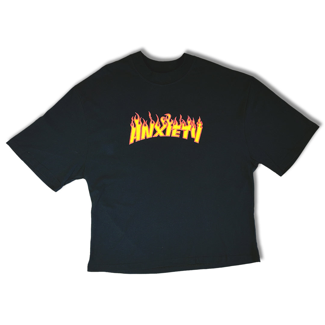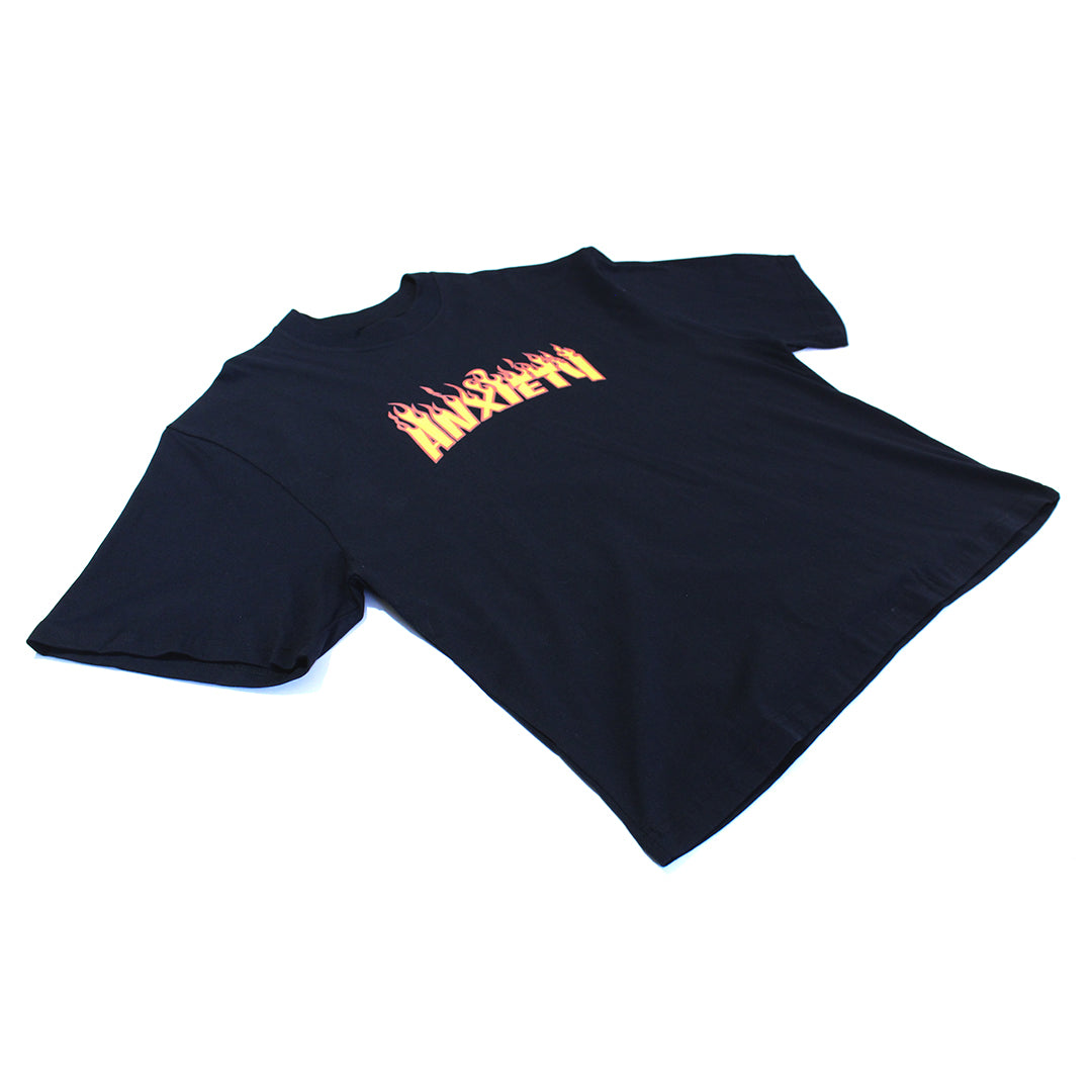 This t-shirt is about the anxiety you get when you want to fit in. The designer couldn't afford a "Thrasher" t-shirt when it was trendy to have one - so they made this, protesting the pressure they felt to follow the crowd.